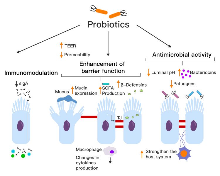 除了在飲食方面減少過敏原刺激[5],像是麩質、糖和乳製品都是常見的過敏原,在飲食中避免食用可以降低乳糜瀉[6],避免腸道持續受損,還可以攝取修復腸道組織益生菌及麩醯胺酸來達到修復效果,服用益生菌的主要作用包括維持體內平衡和腸道完整性、調節腸道轉運、產生短鏈脂肪酸和維生素,並提供酵素消化活性以降解未消化的纖維,以及調節黏液分泌,維持上皮和微生物群的腸道通透性[4]。